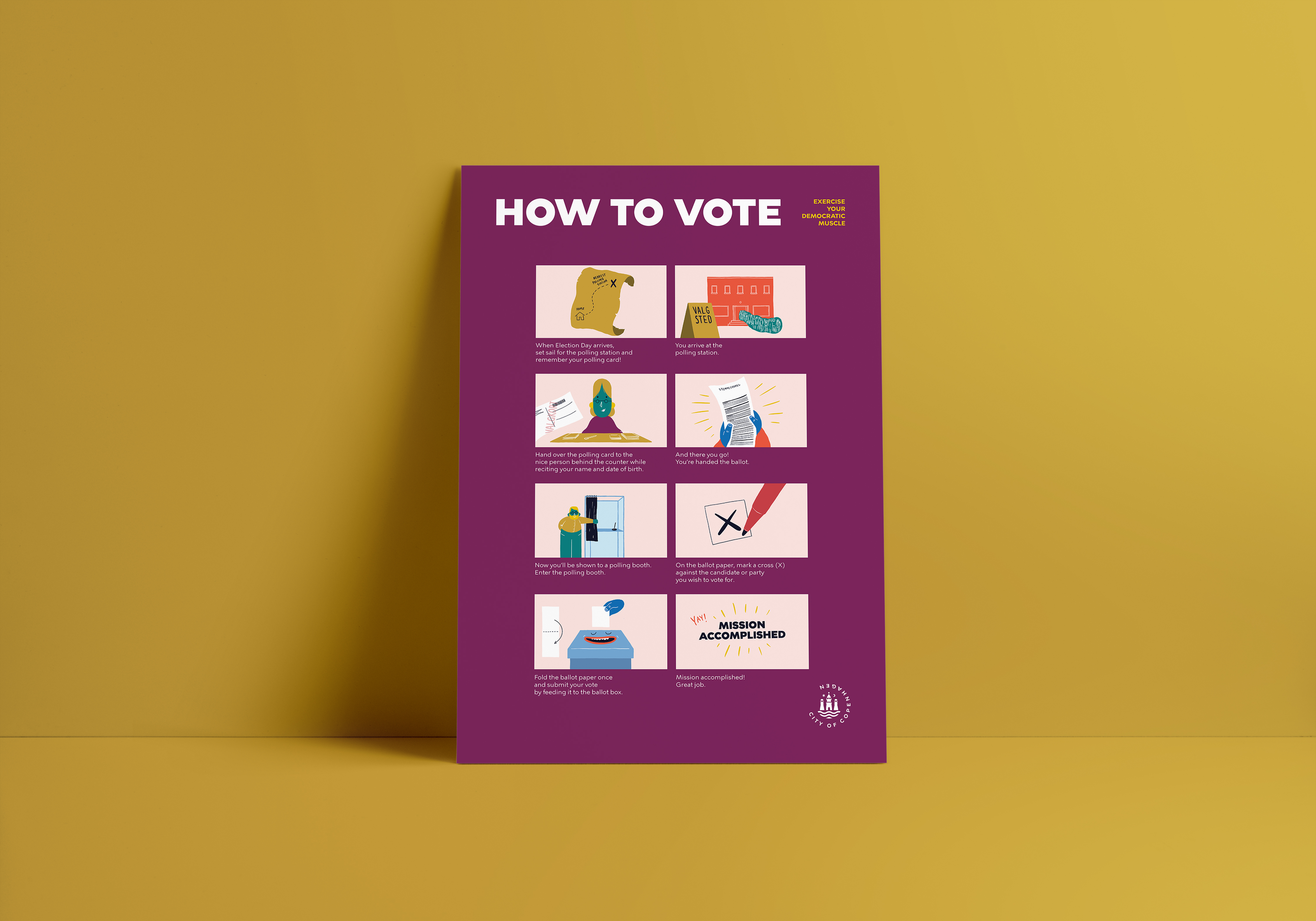 City of Copenhagen asked us to do a campaign on Danish democracy targeted young international citizens. Through videos, posters and handouts we shed light on the Danish municipal- and regional elections, on how to vote and on the Danish democracy in general. All in a casual and humorous tone of voice and with a colourful visual language.